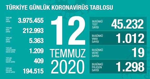 - Türkiye'de son 24 saatte 933 kişiye Kovid-19 tanısı konuldu, 21 kişi hayatını kaybetti, toplam vaka sayısı 216 bin 873, can kaybı 5 bin 440 oldu.
