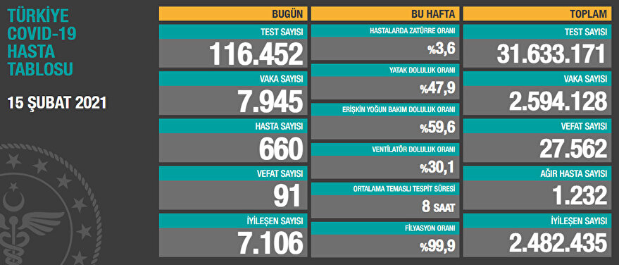 Test sayısı 31 milyon 866 bin 86'ya ulaştı. Vaka sayısı 2 milyon 609 bin 359, vefat sayısı 27 bin 738, ağır hasta sayısı 1193 oldu.