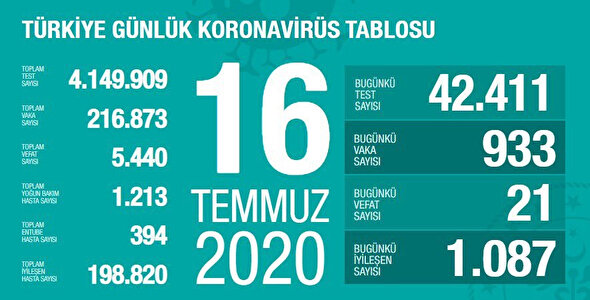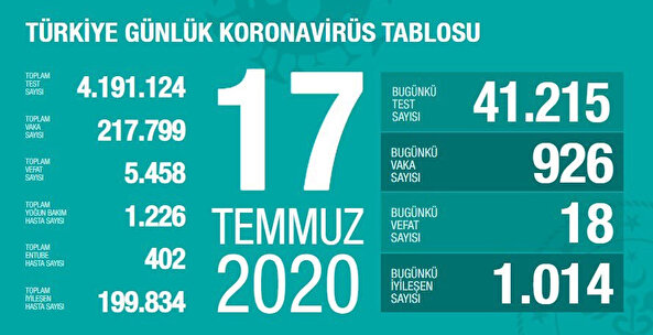 Sağlık Bakanı Fahrettin Koca, 18 Temmuz günü itibari ile son 24 saatte gerçekleşen koronavirüsle ilgili ölüm ve toplam vaka sayısını açıkladı. Bugün 918 kişiye Kovid-19 tanısı konuldu, 17 kişi hayatını kaybetti, toplam vaka sayısı 218 bin 717, can kaybı 5 bin 475 oldu. Bakan Koca, son 3 günde en çok vaka görülen beş il ile en az vaka görülen beş ili açıkladı.