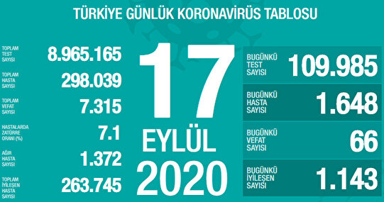 - Son 24 saatte 68 kişi Kovid-19 nedeniyle hayatını kaybetti, 1312 kişi ise iyileşti. Kovid-19 tedavisi tamamlananların sayısı 266 bin 117'ye çıktı. Test sayısı 9 milyon 173 bin 694, vaka sayısı 301 bin 348, vefat sayısı 7 bin 445 olarak kayıtlara geçti.