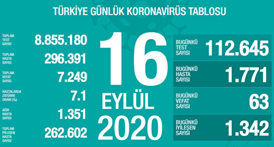 Sağlık Bakanlığının Koronavirüs Bilgilendirme Sayfası'ndaki veriler güncellendi ve 19 Eylül koronavirüs tablosu açıklandı. Tabloya göre bugün vefat sayısı düne göre daha yüksek. Ağır hasta sayısı ise artmaya devam ediyor. Sağlık Bakanı Fahrettin Koca bugünün koronavirüs tablosuna ilişkin Twitter hesabından ayptığı paylaşımda ağır hasta sayısıyla ilgili özellikle uyarıda bulundu ve tedbirin önemine dikkat çekti. İşte 19 Eylül vefat, vaka, ağır hasta, iyileşen sayısı.