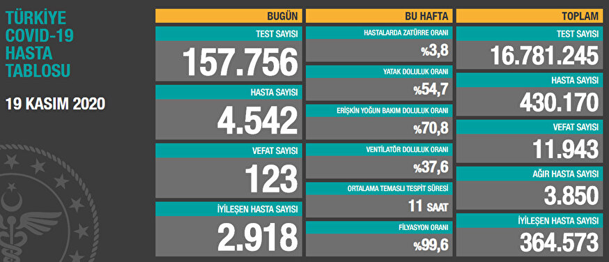 Sağlık Bakanı Fahrettin Koca, 19 Kasım günü itibari ile son 24 saatte gerçekleşen koronavirüsle ilgili ölüm ve hasta sayısını paylaştı. Bakan Koca verileri, Sağlık Bakanlığının koronavirüs bilgilendirme sayfasına ait linki paylaşarak duyurdu.