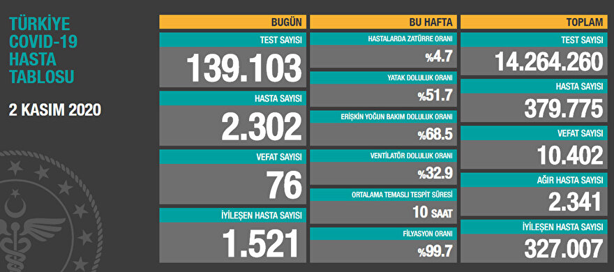 - "Bugün tespit edilen 2302 hastamız var.Ağır hasta sayımız bugün düne göre 164 artarak 2341’e ulaştı. Salgınla mücadelede sadece sağlık çalışanlarının fedakarlığı ile başarılı olamayız.Hep birlikte mücadeleye katılmalı ve tedbirlerden taviz vermemeliyiz."