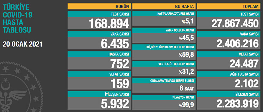Sağlık Bakanlığı, 20 Ocak günü itibari ile son 24 saatte gerçekleşen koronavirüsle ilgili ölüm ve hasta sayısını paylaştı. Ölü sayısı kısmen düşerken günlük vaka sayıları dalgalanmaya devam ediyor. İşte bakanlığın açıkladığı kritik koronavirüs tablosu verileri...