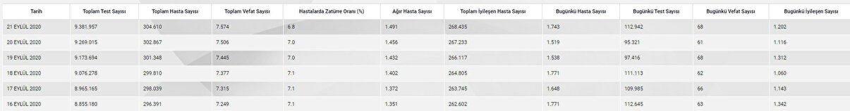 Sağlık Bakanlığının Koronavirüs Bilgilendirme Sayfası'ndaki veriler güncellendi ve 21 Eylül koronavirüs tablosu açıklandı. Sağlık Bakanlığı son 24 saatte 68 kişinin hayatını kaybettiğini, 1743 kişiye ise koronavirüs tanısı konduğunu açıkladı. Ağır hasta sayısı yine yükseldi. İşte can yakan koronavirüs tablosu.