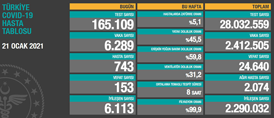 Son 24 saatte 5 bin 811 kişinin Kovid-19 tedavisi ya da karantinasının sona ermesiyle iyileşen sayısı 2 milyon 301 bin 861'e yükseldi. Test sayısı 28 milyon 348 bin 659'a ulaştı. Vaka sayısı 2 milyon 424 bin 328, vefat sayısı 24 bin 933, ağır hasta sayısı 1962 oldu.