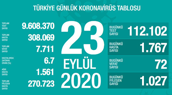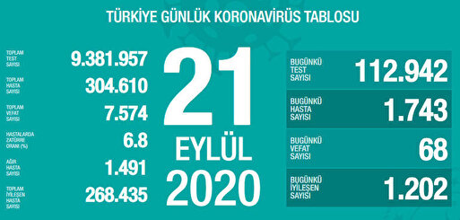 Toplam test sayısı 9 milyon 834 bin 572, hasta sayısı 311 bin 455, vefat sayısı 7 bin 858 olarak kayıtlara geçti. Aktif hasta sayısı 30 bin 315, ağır hasta sayısı 1601, hastalarda zatürre oranı ise yüzde 6,6 oldu.