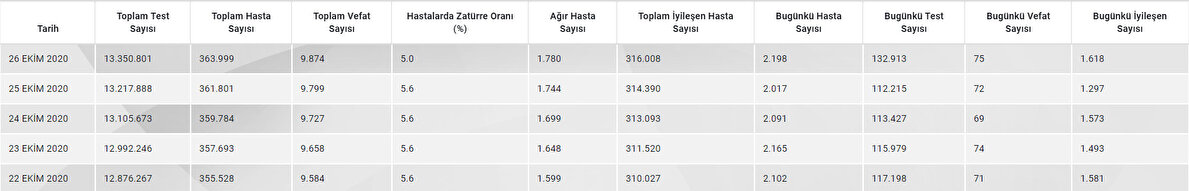 Sağlık Bakanlığının sitesindeki Koronavirüs Bilgilendirme Sayfası'nda 27 Ekim koronavirüs tablosu açıklandı. Ağır hasta sayısının yükseldiğini vurgulayan Sağlık Bakanı Koca yaptığı açıklamada, "Ağır hasta ve aktif hasta sayısı düşmeden başarılı olamayız. Mücadele birlikteliği tedbirleri istisnasız uygulamaktan geçiyor. Salgına karşı organize olalım." ifadelerini kullandı. İşte o kritik veriler...