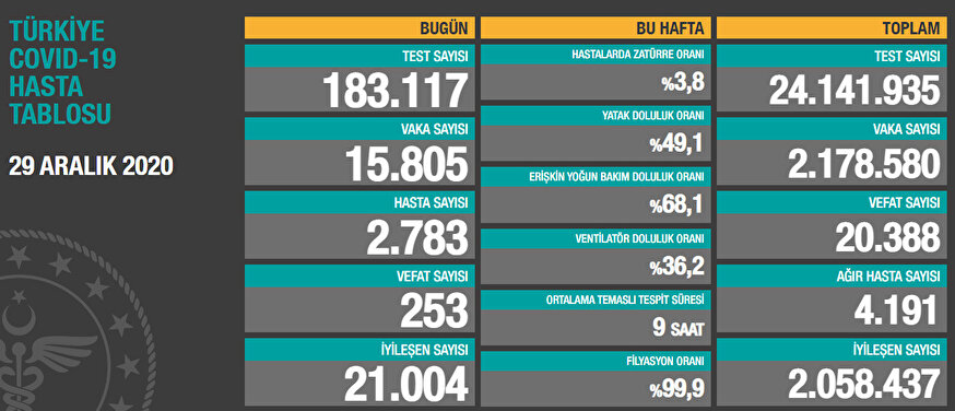 Haftalık verilere göre, bu hafta hastalarda zatürre oranı yüzde 3,8, yatak doluluk oranı yüzde 49,1, erişkin yoğun bakım doluluk oranı yüzde 68,1, ventilatör doluluk oranı yüzde 36,2, ortalama temaslı tespit süresi 9 saat, filyasyon oranı ise yüzde 99,9 olarak gerçekleşti.