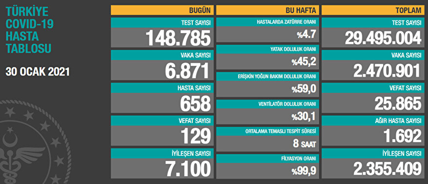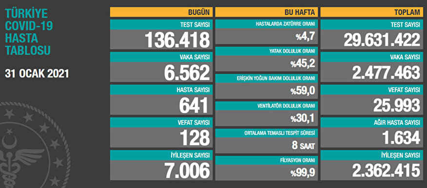 - Haftalık verilere göre, bu hafta hastalarda zatürre oranı yüzde 4,9, yatak doluluk oranı yüzde 45,4, erişkin yoğun bakım doluluk oranı yüzde 59,1, ventilatör doluluk oranı yüzde 27,1, ortalama temaslı tespit süresi 6 saat, filyasyon oranı ise yüzde 99,9 olarak gerçekleşti.