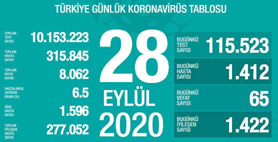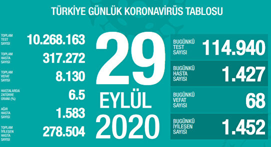 Sağlık Bakanlığının Koronavirüs Bilgilendirme Sayfası'nda yer alan veriler güncellendi. 30 Eylül koronavirüs tablosunda bulunan verilere göre ölü ve vaka sayısında düne göre düşüş gerçekleşti. Sağlık Bakanı Fahrettin Koca, verilere ilişkin Koronavirüs Bilim Kurulu Toplantısı'nın ardından düzenlediği basın toplantısında önemli açıklamalarda bulundu. Zatürre oranı hakkında da bilgilendirme yapan Koca, "Zatürre oranımız yüzde 6,4'e kadar indi. Nisan ayında yüzde 30'a yakın olan zatürre oranı neredeyse 5'te 1 oranına inmiş oldu. Zatürre oranımız yüzde 6,4'e kadar indi. Nisan ayında yüzde 30'a yakın olan zatürre oranı neredeyse 5'te 1 oranına inmiş oldu" ifadelerini kullandı. İşte 30 Eylül koronavirüs ölü, vaka, iyileşen sayısı...