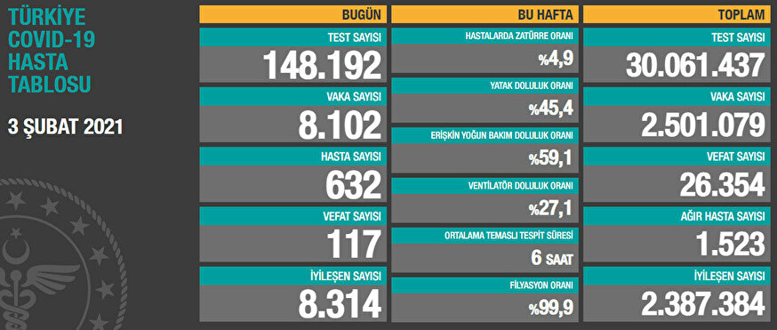 - Tabloda haftalık oranlar ise hastalarda zatürre oranı yüzde 4,9, yatak doluluk oranı yüzde 45,4, erişkin yoğun bakım doluluk oranı yüzde 59,1, solunum cihazına bağlı (ventilatör) doluluk oranı yüzde 27,1, ortalama temaslı tespit süresi 6 saat, filyasyon oranı yüzde 99,9 şeklinde yer aldı.