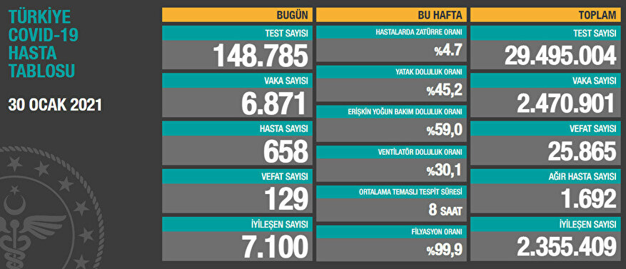 Bugünkü verilerle toplam test sayısı 30 milyon 349 bin 42 toplam vaka sayısı 2 milyon 516 bin 889, toplam vefat sayısı 26 bin 577, toplam ağır hasta sayısı 1423, toplam iyileşen hasta sayısı 2 milyon 404 bin 416 oldu.