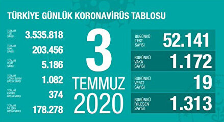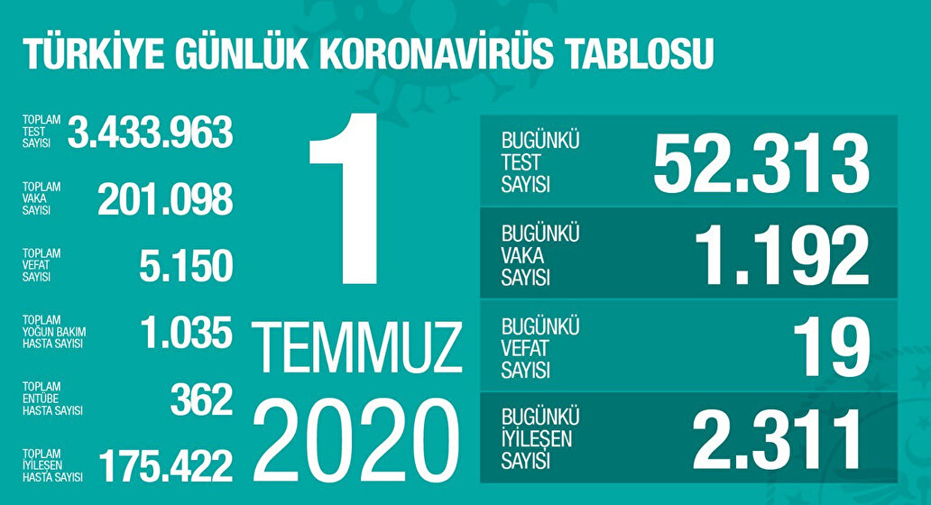 Sağlık Bakanı Fahrettin Koca, 6 Temmuz günü itibari ile son 24 saatte gerçekleşen koronavirüsle ilgili ölüm ve toplam vaka sayısını açıkladı. Bakan Koca, verileri Sağlık Bakanlığı Korona Tablosunun görseliyle duyurdu.