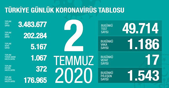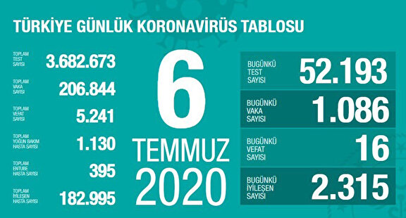 - Türkiye'de son 24 saatte 1086 kişiye koronavirüs (Kovid-19) tanısı konuldu, 16 kişi hayatını kaybetti, toplam vaka sayısı 206 bin 844, can kaybı 5 bin 241 oldu.