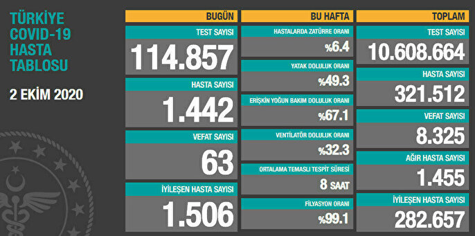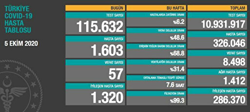 Toplam test sayısı 11 milyon 160 bin 946'ya ulaştı. Hasta sayısı 329 bin 138, vefat sayısı 8 bin 609, ağır hasta sayısı 1411, aktif hasta sayısı 31 bin 575 oldu.