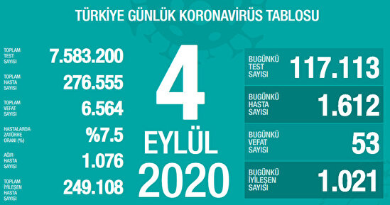 Sağlık Bakanlığının koronavirüs (Kovid-19) bilgilendirme sayfasındaki veriler güncellendi. Açıklanan 7 Eylül