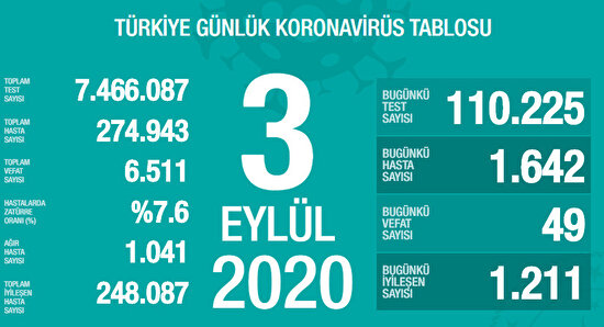 Sağlık Bakanlığı, 7 Eylül koronavirüs (Kovid-19) sonuçlarını açıkladı. Bakanlığın koronavirüsle ilgili bilgilendirme sayfasındaki güncellenen verilere göre Türkiye'de son 24 saatte koronavirüsten 57 kişi hayatını kaybederken yeni hasta sayısı ise bin 703 oldu. Ölü ve vaka sayısında devam eden artış endişe uyandırıyor. Sağlık Bakanı Fahrettin Koca verilerle ilgili twitter hesabından yaptığı paylaşımda vaka sayısının en çok olduğu ili aktardı. Ayrıca Koca, ağır hasta sayısındaki yükselişin de devam ettiğini belirtti.