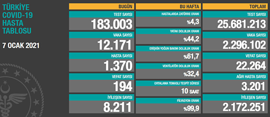 Güncel verilere göre, son 24 saatte 183 bin 3 Kovid-19 testi yapıldı, 12 bin 171 kişinin testi pozitif çıktı, 194 kişi hayatını kaybetti.