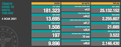 Haftalık verilere göre, bu hafta hastalarda zatürre oranı yüzde 4,3, yatak doluluk oranı yüzde 44,2, erişkin yoğun bakım doluluk oranı yüzde 61,7, ventilatör doluluk oranı yüzde 32,4, ortalama temaslı tespit süresi 10 saat, filyasyon oranı ise yüzde 99,9 olarak gerçekleşti.