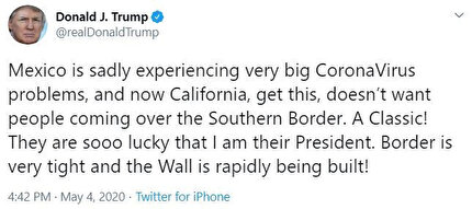 ABD Başkanı Trump sosyal medya hesabından yaptığı paylaşımda, Meksika’da koronavirüsün büyük bir problem haline geldiğini, güney sınırının çok sıkı denetim altına olduğunu ve duvarın hızla inşa edildiğini ifade etti.