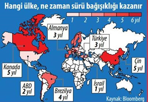 Koronavirüs kâbusu sürerken, herkesin aklında ‘Hayat ne zaman normale döner’ sorusu var. Amerikan Bloomberg kanalının hesaplamasına göre, eğer aşı dağıtımı bu hızla sürer ve yeni varyantlara karşı da etkili olursa küresel sürü bağışıklığının kazanılması 7 yıl alabilir. İki doz aşıya göre yapılan hesaplamada, Türkiye’nin ise 2.6 yıl sonra nüfusunun yüzde 75’ini aşılayarak sürü bağışıklığı kazanması öngörülüyor. Bu süre, 3.2 yıl ile Almanya, 3.4 yıl ile Brüksel ve 3.9 yıl ile Hollanda gibi pek çok Avrupa ülkesinin önünde.