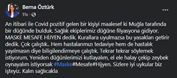 Sosyal medyadan yaptığı paylaşımda Öztürk, “An itibari ile Kovid pozitif gelen bir kişiyi maalesef ki Muğla tarafında bir düğünde bulduk. Sağlık ekiplerimiz düğüne filyasyona gidiyor. Maske, mesafe, hijyen dedik. Kurallara uyulmazsa bu yasakları getirir dedik. Çok çalıştık.