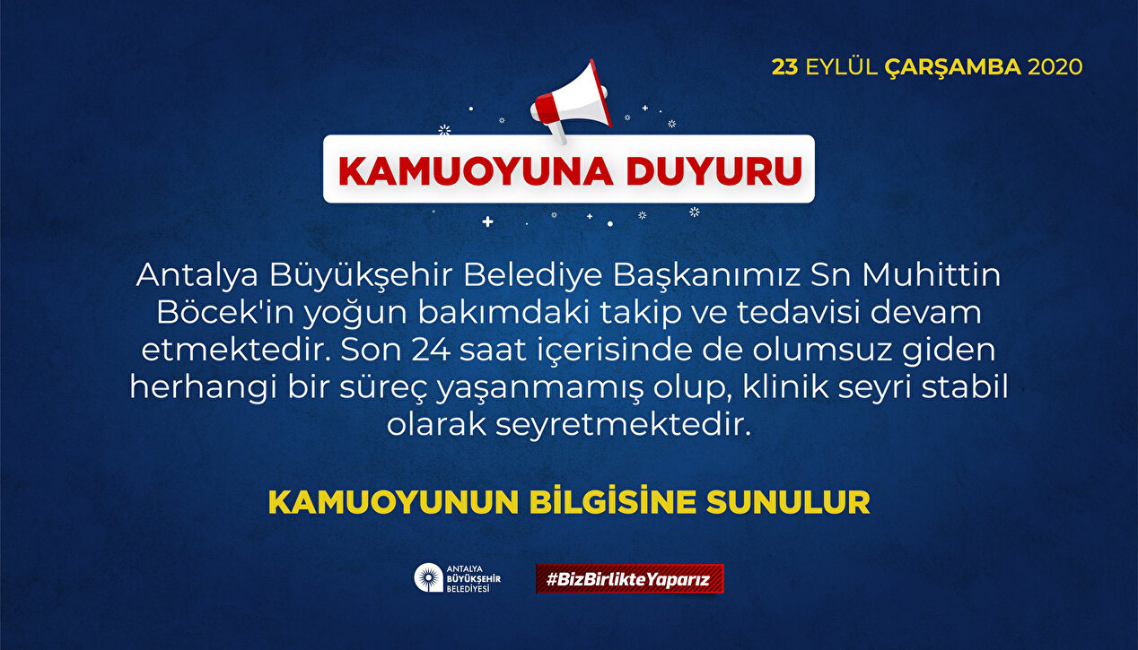 “Antalya Büyükşehir Belediye Başkanımız Sn. Muhittin Böcek'in yoğun bakımdaki takip ve tedavisi devam etmektedir. Son 24 saat içerisinde de olumsuz giden herhangi bir süreç yaşanmamış olup, klinik seyri stabil olarak devam etmektedir."