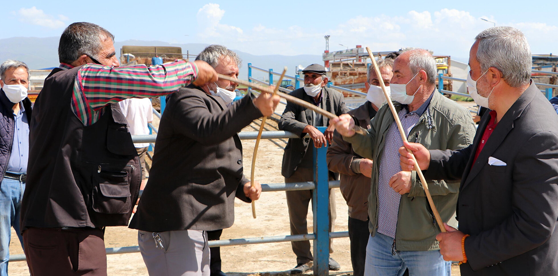Erzurum'daki hayvan pazarında, koronavirüsün ardından başlatılan normalleşme sürecinde hareketlilik yaşanıyor. Besiciler, binbir zahmetle yetiştirdikleri hayvanlarını, canlı hayvan pazarına getirerek satın almak isteyenlerle, sıkı pazarlığa giriyor. Ancak pazarlık eski usul olan tokalaşarak yapılmıyor. Taraflar, ellerindeki sopaların ucundan tutuyor.