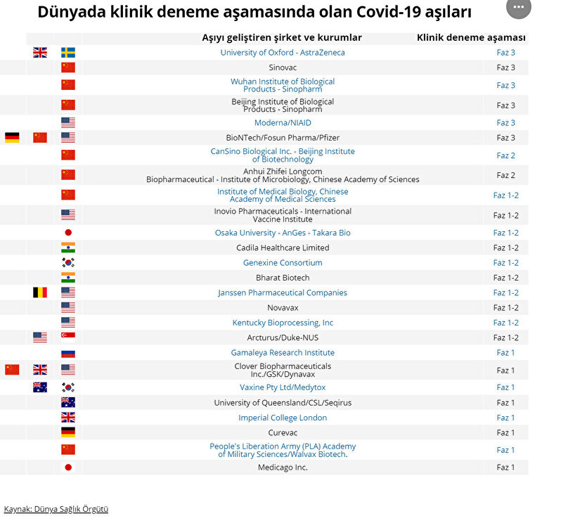 Dünya Sağlık Örgütü'nün verdiği bilgilere göre, 182 aşı adayı eylül ayı başı itibariyle klinik öncesi değerlendirme aşamasında yer alıyor. Aralarında 36 aşı adayının klinik denemeleri devam ediyor. 9 aşı adayının insan üzerinde denemelerine başlandı.