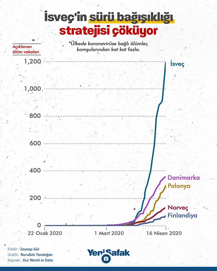 Avrupa'da koronavirüse karşı sürü bağışıklığı stratejisini uygulayan iki ülkeden biri olan İsveç'te işler yolunda gitmiyor. Ülkede ölüm sayıları komşularından kat kat fazla. İsveç'te koronavirüsten hayatını kaybedenlerin sayısı bin 300'e yaklaşırken, bu sayı Danimarka'da 346 , Norveç'te 164, Finlandiya'da ise 90.