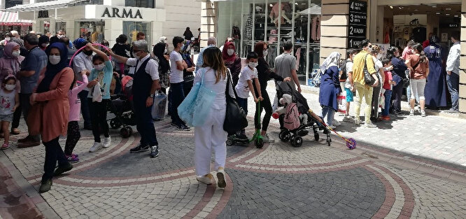 Mağaza içinde tedbirlere uyulurken, mağaza dışında ise durum farklı oldu. Kuyrukta bekleyen ailelerin ve çocukların maske taktığı görülürken, mağaza önünde oluşan sosyal mesafesiz kuyruk ise dikkat çekti. İç içe kuyrukta bekleyen aileler ve küçük çocuklar koronavirüse davetiye çıkardı.