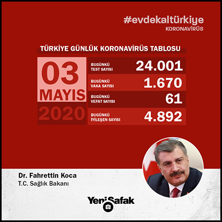 Sağlık Bakanı Fahrettin Koca, 3 Mayıs günü itibari ile son 24 saatte koronavirüsle ilgili ölüm ve toplam vaka sayısını açıkladı. Türkiye’de son 24 saatte 61 kişi hayatını kaybetti, bin 670 kişiye koronavirüs tanısı kondu, toplam vaka sayısı 126 bin 45, can kaybı 3 bin 397 oldu. Tedavisi tamamlanan 4 bin 892 kişi ise taburcu edildi. Bakan Koca, yaptığı açıklamada, 11 Mart’tan bu yana ilk kez iyileşen hasta sayısının mevcut koronavirüs hasta sayısını geçtiğini söyledi.