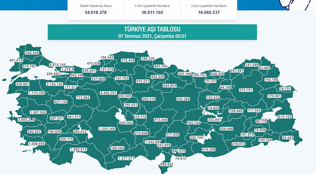 Sağlık Bakanlığının Türkiye'nin Aşı Tablosu haritasına göre, Toplam yapılan aşı dozu sayısı 54 milyon 618 bin 378 oldu.
