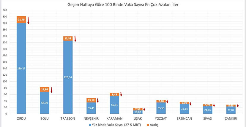 "Son hafta 100.000 nüfusta vaka görünme oranı en çok artan illerimiz: Sinop, Kilis, Samsun, Amasya ve Edirne. En çok azalan illerimiz: Ordu, Bolu, Trabzon, Nevşehir ve Karaman. Birlikte tedbirlere uyarak tüm illerimizi mavi kategoriye sokalım."