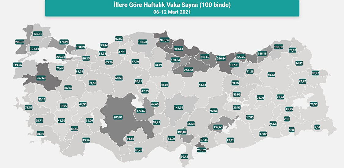 Sağlık Bakanlığı tarafından açıklanan illere göre haftalık vaka sayılarında (100 binde) Antalya 95.10, Balıkesir 257.60, Kayseri 142.95, Kocaeli 138.39 ve Samsun 458.53 kişi ile bölgesinde riskli iller arasında yer alıyor.