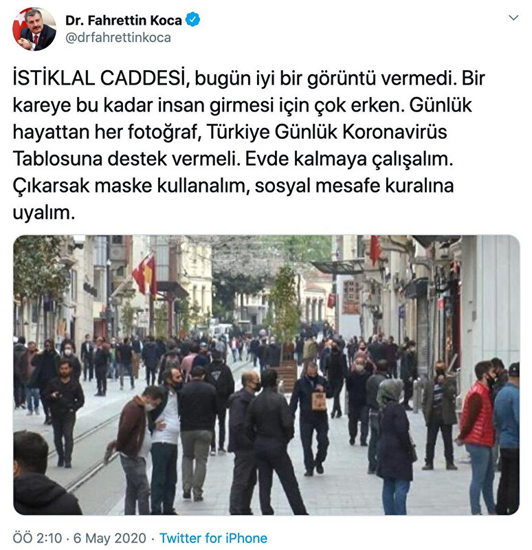 Koronavirüs salgınında Türkiye'deki ölüm sayılarında gerileme, iyileşen hasta sayısında ise büyük artış yaşanırken dün İstiklal Caddesi'nde çekilen bir görüntüye Sağlık Bakanı Fahrettin Koca tepki gösterdi. Bakan Koca, İstiklal Caddesi'ndeki kalabalığa ilişkin "Bugün iyi bir görüntü vermedi. Bir kareye bu kadar insan girmesi için çok erken" ifadesini kullandı.