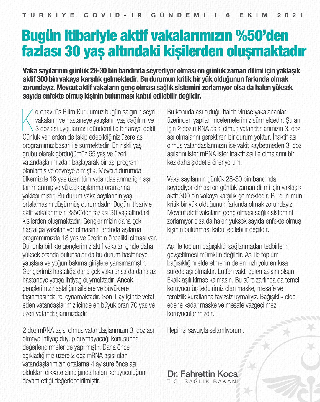 Koronavirüs Bilim Kurulu toplantısının ardından sosyal medya hesabından yazılı bir açıklama yapan Sağlık Bakanı Fahrettin Koca, bugün itibariyle aktif vakaların yüzde 50'den fazlasının 30 yaş altındaki kişilerden oluştuğunu açıkladı. Bakan ayrıca, Biontech aşısı olan vatandaşlar için üçüncü doza gerek olmadığını ifade etti.