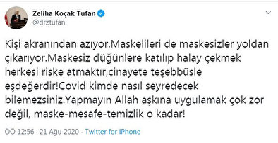 Prof. Dr. Tufan sosyal paylaşım sitesi Twittter'daki hesabından yaptığı açıklamada, "Kişi akranından azıyor. Maskelileri de maskesizler yoldan çıkarıyor. Maskesiz düğünlere katılıp halay çekmek herkesi riske atmaktır, cinayete teşebbüsle eşdeğerdir. koronavirüs kimde nasıl seyredecek bilemezsiniz.Yapmayın Allah aşkına uygulamak çok zor değil, maske-mesafe-temizlik o kadar" ifadesini kullandı.