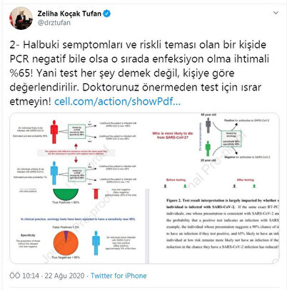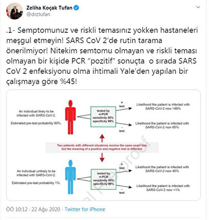 Tufan, semptomları ve riskli teması olmayanların hastaneleri meşgul etmemesini isteyerek, "SARS CoV 2'de rutin tarama önerilmiyor. Nitekim semtomu olmayan ve riskli teması olmayan bir kişide PCR 'pozitif' sonuçta o sırada SARS CoV 2 enfeksiyonu olma ihtimali Yale'den yapılan bir çalışmaya göre yüzde 45. Halbuki semptomları ve riskli teması olan bir kişide PCR negatif bile olsa o sırada enfeksiyon olma ihtimali yüzde 65. Yani test her şey demek değil, kişiye göre değerlendirilir. Doktorunuz önermeden test için ısrar etmeyin" ifadelerini kullandı.