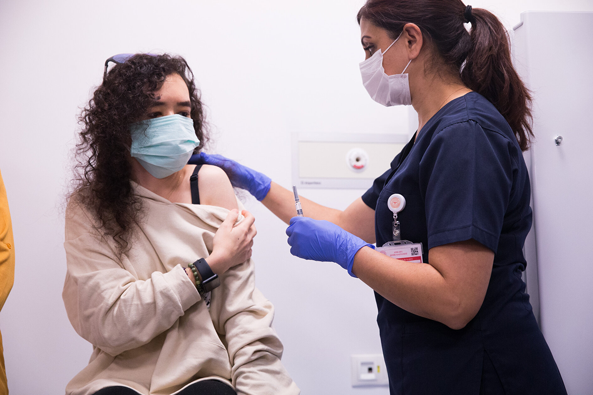 Ankara Şehir Hastanesi Enfeksiyon Hastalıkları Kliniğindeki aşı uygulaması için öğretmen Ayşegül Durmaz, kızı Gökçe Durmazla aşı için gönüllü oldu.