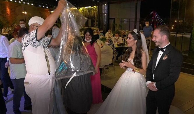 - Nermin Yücebaş, gelin Ebru Atsan’a sarılarak tebrik etmek istedi. Bu sırada Altan Yücebaş eşini korona virüse karşı korumak için yanında getirdiği yorgan poşetini eşinin kafasından geçirip daha sonra gelin ve damada sarılarak tebrik etmesini sağladı. Nermin Yücebaş, kafasında poşetle gelin ve damada sarılarak tebrik etti. Altan Yücebaş, kutlamanın ardından eşinin başına geçirdiği poşeti çıkardı. Poşetli korona önlemi ilginç görüntüler oluşturdu.