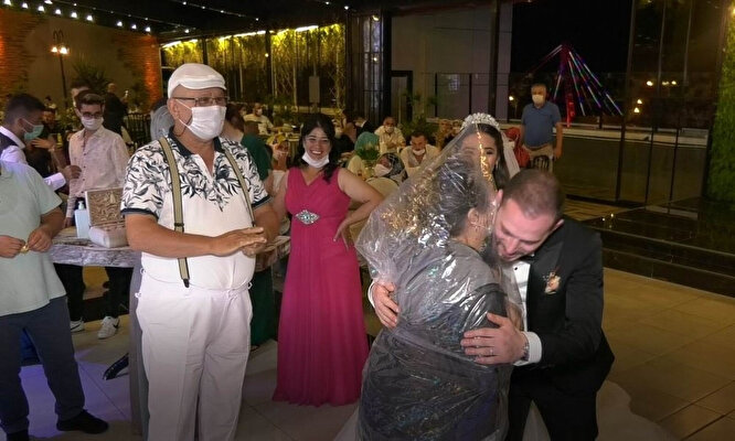 Samsun'da düğünlerde görülmemiş bir koronavirüs önlemi yapıldı. Gelinin yakını takı taktıktan sonra kafasına poşet geçirdi ve gelin ve damada bu şekilde sarıldı.