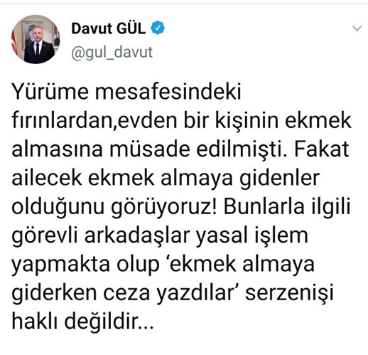 ürüme mesafesindeki fırınlardan, evden bir kişinin ekmek almasına müsaade edilmişti. Fakat ailecek ekmek almaya gidenler olduğunu görüyoruz. Bunlarla ilgili görevli arkadaşlar yasal işlem yapmakta olup 'ekmek almaya giderken ceza yazdılar' serzenişi haklı değildir