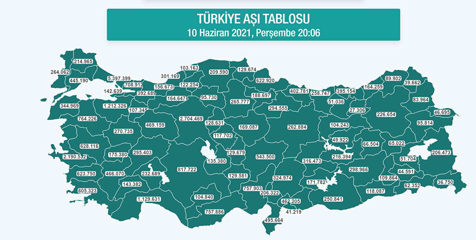 Sağlık Bakanlığının "covid19asi.saglik.gov.tr" adresinde yer alan anlık verilere göre, 10 Haziran saat 19.45 itibarıyla uygulanan birinci doz aşı sayısı 18 milyon 727 bin 608, ikinci doz aşı 13 milyon 485 bin 511 oldu. Böylece toplam doz miktarı, 32 milyon 213 bin 119 olarak gerçekleşti.
