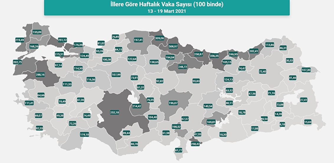 Sağlık Bakanı Fahrettin Koca, sosyal medya hesabından yaptığı paylaşımla, illere göre haftalık vaka sayılarını açıkladı. Haftalık koronavirüs vaka sayısı her 100 bin kişide İstanbul'da 251.12, Ankara'da 107.99, İzmir'de 111.41 oldu. Samsun, Giresun, Sinop, Balıkesir ve Yalova 100 bin kişide en çok koronavirüs vakası görülen iller oldu.