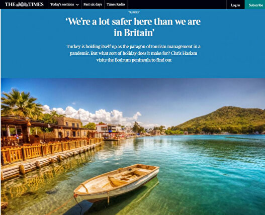 Dünyayı etkisi altına alan koronavirüsle mücadelede alınan önlemler sayesinde salgını kontrol altına alan Türkiye, turistlerin de tatil için en güvenli gördüğü ülkeler arasına girdi. Yabancı turistler akın akın yurda gelirken, dünya basını da Türkiye'nin sağlık sistemini öve öve bitiremiyor. Son olarak İngiltere'nin önde gelen yayın kuruluşlarından The Times gazetesinin gezi editörü Chris Haslam, Türkiye'ye övgüler yağdırdı. Bodrum'da yaptığı tatil boyunca İngiltere'den daha güvende olduğunu söyleyen Haslam, "Güvenli tatilin tek adresi Türkiye" ifadelerini kullandı.