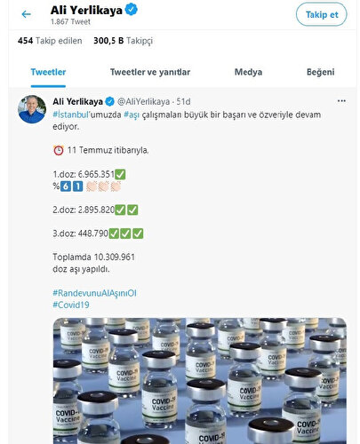 İstanbul'da aşı çalışmalarının büyük bir başarı ve özveriyle devam ettiğinin altını çizen Yerlikaya, "11 Temmuz itibarıyla 1. doz: 6 milyon 965 bin 351, 2. doz: 2 milyon 895 bin 820, 3. doz: 448 bin 790 toplamda 10 milyon 309 bin 961 doz aşı yapıldı." bilgisini verdi.