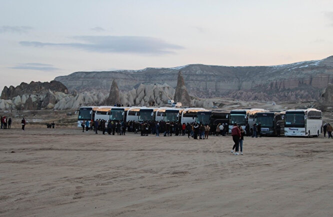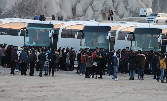Kapadokya bölgesinde sabahın erken saatlerinde balon turlarına izlemek üzere bölgeye gelen 8 tur otobüsünde bulunan öğrenci grupları balon turlarının iptal edilmesinin ardından koronavirüs kurallarına hiçe sayarak halay çekip oyun havasında oyunlar oynaması kameralara yansıdı.