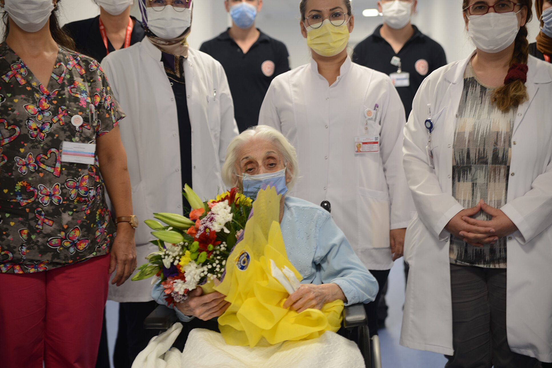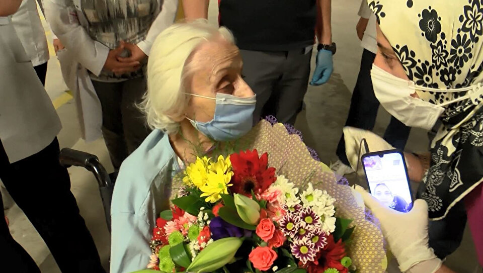 AnkaraŞehir Hastanesi'nde koronavirüsü yenen emekli hemşire Fatma B. (94), sağlık çalışanlarının alkışlarıyla taburcu edildi. Fatma B., kendisini çiçeklerle uğurlayan sağlık çalışanlarına teşekkür ederek, "Sanki yeniden doğmuş gibiyim" dedi.